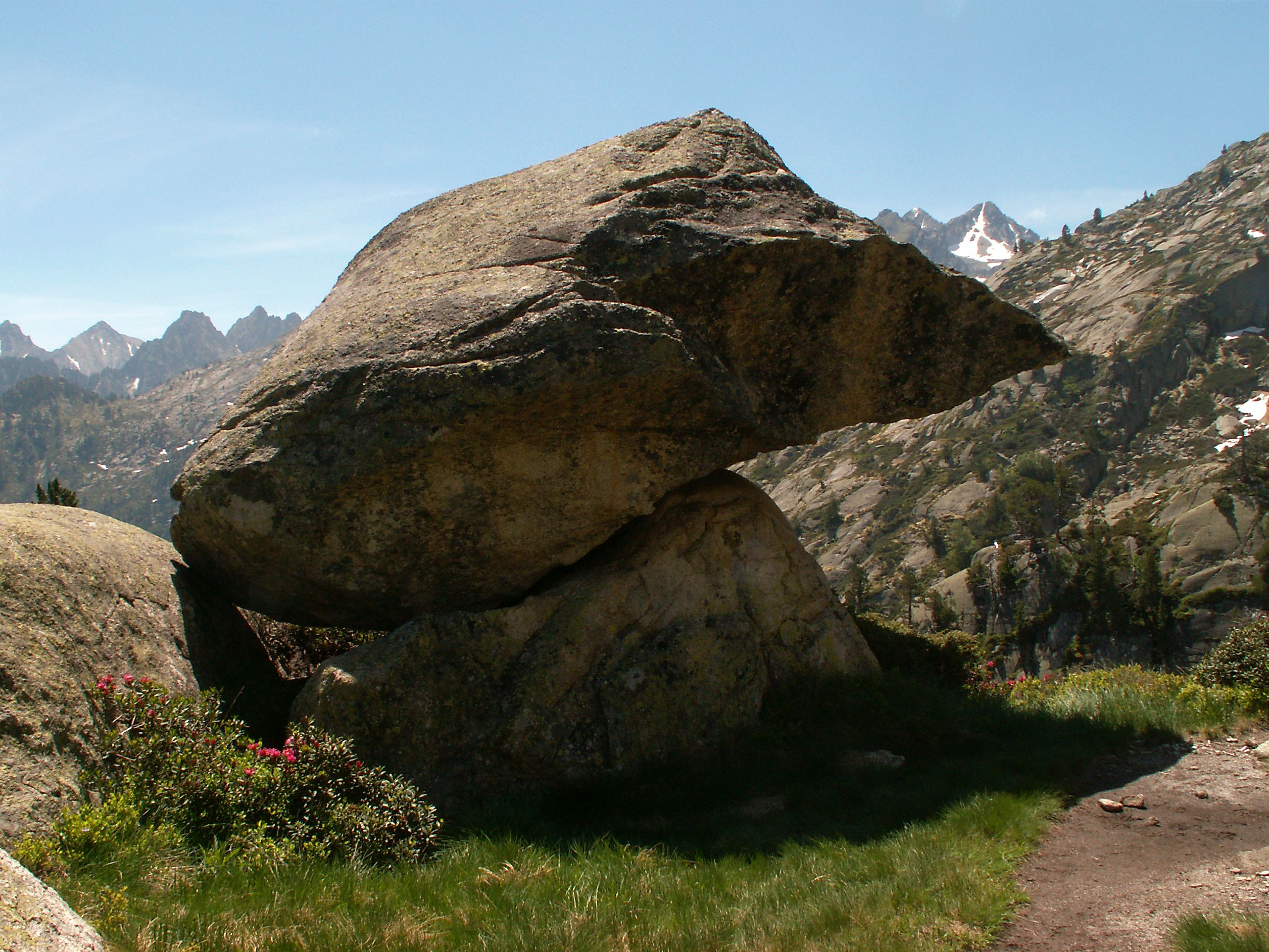 Un rocher propice à une halte bien méritée à l'abri du soleil, sur le sentier menant aux Lacs de l'Embarrat et Pic de la Cardinquère (Vallée du Marcadau, Hautes-Pyrénées).