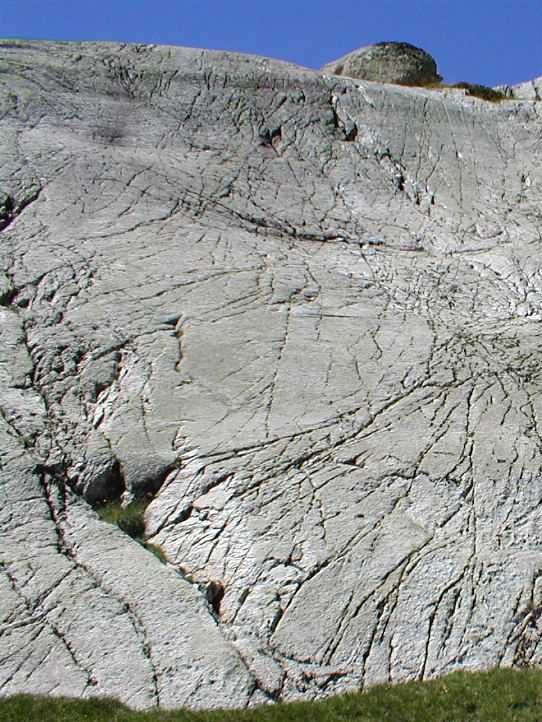 Cette roche polie et striée témoigne des fortes contraintes dues à l'activité glaciaire dans les environs des Lacs de Cambalès (Alt. 2 342m, Vallée du Marcadau, Hautes-Pyrénées).